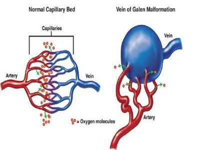 A Vein of Galen Malformation (VOGM) is a type of cerebral arteriovenous malformation (AVM), a rare blood vessel abnormality inside the brain. In VOGMs, misshapen arteries in the brain connect directly with veins instead of connecting with capillaries, which help slow blood flow. This causes a rush of high-pressure blood into the veins. The high-pressure blood flow frequently leads to congestive heart failure and/or hydrocephalus. However, every VOGM is different. The severity of the condition and the severity of its correlating symptoms differ from child to child. Most children experience some stress on the heart or hydrocephalus before or shortly after birth, and most children have at least subtle symptoms by the time they reach one month old.